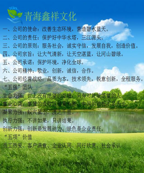 公司本着“服务社会,诚实守信,发展自我,创造价值”的基本原则,打造青海一流环境治理企业为目标。遵循一贯为用户精益求精的服务精神,秉承“予天空于蔚蓝、还世界于清新”的经营宗旨,根据用户要求,结合用户的特点,为用户提供全方位服务。