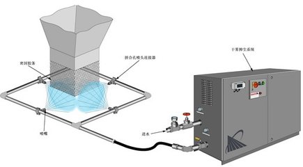 干雾抑尘是把水利用高压空气瞬时吹散,让颗粒处在1um<干雾粒径≦10um的之间的过程,同时大部分吸入粉尘颗粒也处于10um<粒径≦10um的粉尘因干雾颗粒密度增大,颗粒大小一致,比重相近,所有重力一样,故在空气中停留时间相等,这样粉尘颗粒与干雾颗粒就能同时充分凝结,粉尘颗粒起到凝结核的作用,在瞬间降尘。