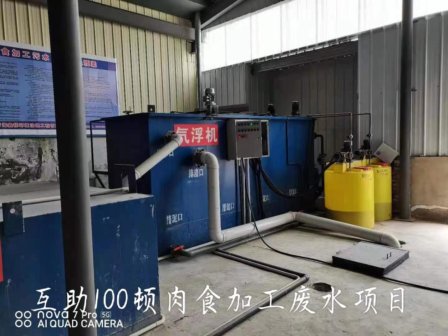 本公司根据历年大中型屠宰废水治理实践经验和理论总结,屠宰废水及冲洗废水中含有大量的油脂,必须采用气浮工艺使油水分离。气浮采用一体化气浮装置,它由池体,溶气罐、空压机及回流水泵组成,由一个电控箱进行控制操作。废水中有大量的细小悬浮物及油脂,通过气浮装置的处理可大大降低上述污染物浓度,在气浮设备工作时加入高分子絮凝剂废水经加药反应后进入气浮池内,与通过TJ型释放器释放的气泡充分混合接触,使水中的絮凝体粘附在微小气泡上,释放的气泡平均直径Φ50um左右,絮体浮向水面形成浮渣,浮渣聚集到一定厚度后,由刮渣机刮入气浮泥槽道送到污泥干化池,气浮池下层的清水一部分经溶气泵抽送供溶气水使用,剩余的清水通过溢流管进入中间水池。