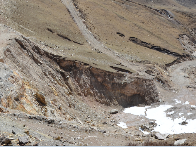 探坑:扰动面积1160㎡,长51m,宽26m,最大深度2.3m,回填压实土方量为1140.4,表层耙松后人工混播针茅草、早熟禾、披肩草等当地原生草种恢复植被1160㎡。