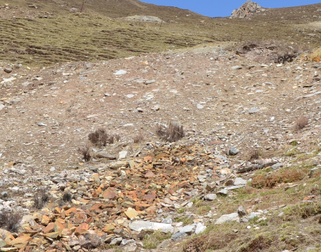 11号压占区域:扰动面积3870㎡,表层块石、碎石客土堆积量为3792.6m3,清运回填至2号探坑,人工混播针茅草、早熟禾、披肩草等当地原生草种恢复植被3870㎡。